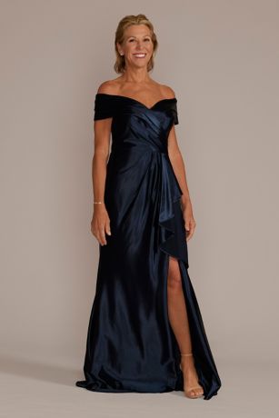 Made from stretch satin, this off-the-shoulder gown is as glamorous as it is comfortable. A cascading ruffle detail enhances the dress's dramatic effect.