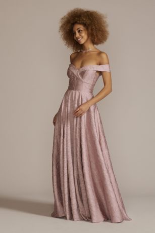 Elegance comes easy in this draped off-the-shoulder ball gown. Brocade fabric adds interest to an already impressive silhouette.