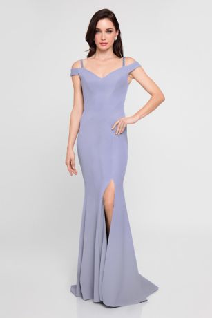 Simple and sophisticated, this cold-shoulder gown is crafted of sleek stretch crepe for a modern look.