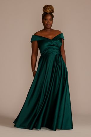 Channel timeless elegance in this satin ball gown featuring an off-the-shoulder sweetheart neckline and delicate side draping on a pleated bodice. The full, sweeping skirt adds a touch of drama to modern sophistication.