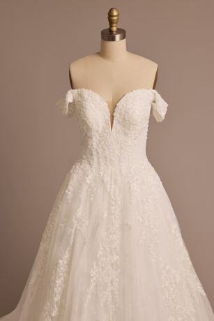 This enchanting off-the-shoulder tulle ball gown captures the romance of the day with a voluminous skirt layered with glitter tulle and floral lace appliques. Horsehair trim along the hem helps the gown keep its full shape, creating unforgettable drama on your big day.