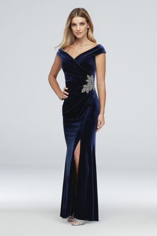 This luxe velvet off-the-shoulder gown is flatteringly pleated at the bodice and completed by a brooch-like beaded applique at the hip.