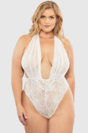Sheer mesh and lace come together to create this plus-size thong bodysuit. Detailed with a plunging neckline and a satin halter tie.