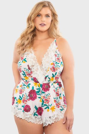 This cross-back plus-size romper features a pretty floral print, a plunging neckline, and lace trim.