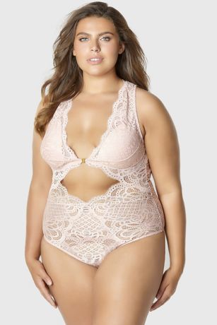 A plunging neckline, keyhole bodice, and an open back lend this plus-size lace bodysuit edgy details. Finished with a front closure.