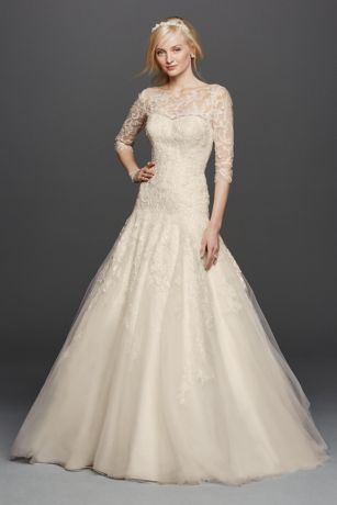 Having the dress of your dreams is now a reality with this three-quarter sleeved, tulle a-line wedding dress! Featuring a delicate illusion lace bodice, this gown features an illusion neckline, dramatic v-back zipper and drop waist.