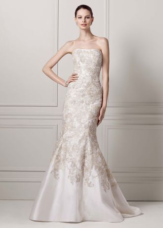 Luxurious and lavish with a refined feel, this mikado mermaid wedding dress features beaded champagne lace appliques