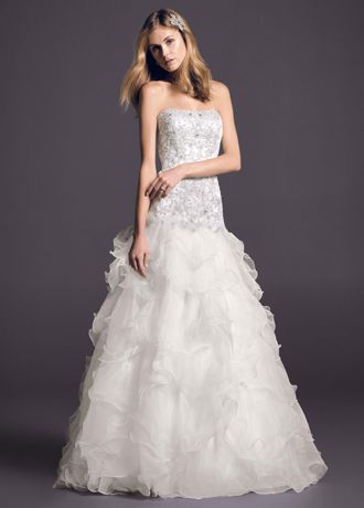 - Strapless beaded organza ball gown features luxurious embroidered lace bodice.