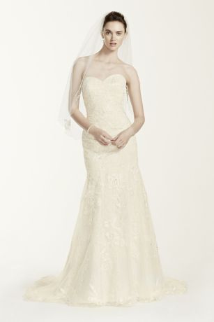 - Tulle and lace mermaid gown with sweetheart neckline, beaded lace appliques, and button-back closure.