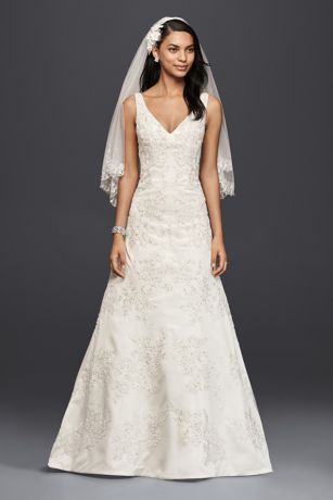 For a classic look that's a dream to accessorize, opt for an elegant A-line wedding gown. The richly textured hand-beaded corded lace applique on the bodice of this A-line dress is complemented by tank straps and a V-neckline.