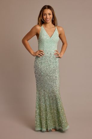 You'll shine at prom in this ombre V-neck sheath dress with head-to-toe beads.