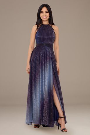 This ombre halter prom dress is accented with a cool linear pattern that sparkles.