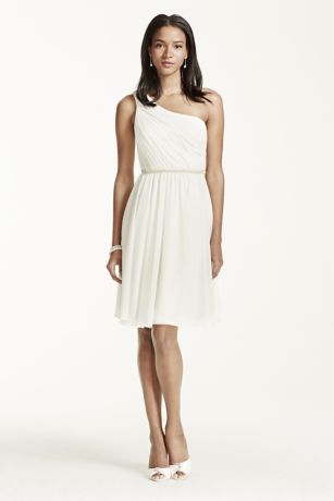 - One shoulder chiffon dress features dazzling pearl beading at the waist.