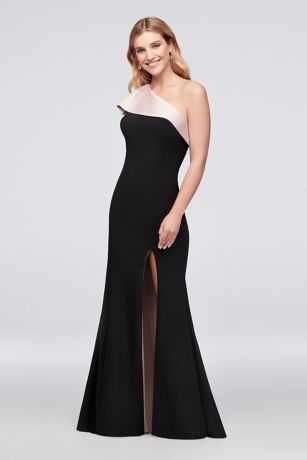 Make a style statement in this chic, one-shoulder stretch-jersey gown, finished with a contrasting asymmetrical ruffle and a matching pop of color at the lining.