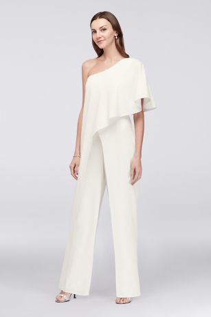 Fluid details transform this crepe jumpsuit into a graceful statement outfit. The one-shoulder flounce cascades across the bodice and down in a asymmetrical line, as the wide-leg pants are crafted of layered, overlapped fabric for graceful movement.