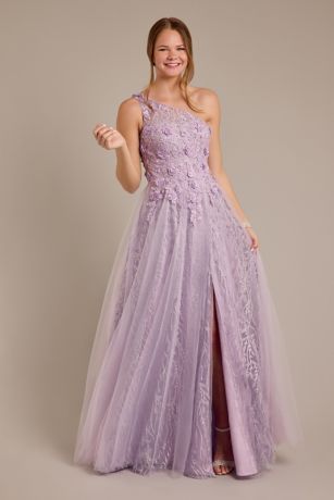 Give off princess vibes at prom in this one-shoulder glitter dress with floral appliques on the bodice.