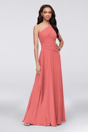 A breathtaking side cascade flows from the asymmetrical draped waistline of this one-shoulder georgette bridesmaid dress. The universally flattering silhouette looks gorgeous on every body type.