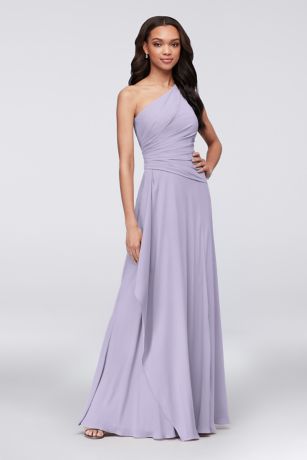 A breathtaking side cascade flows from the asymmetrical draped waistline of this one-shoulder georgette bridesmaid dress. The universally flattering silhouette looks gorgeous on every body type.