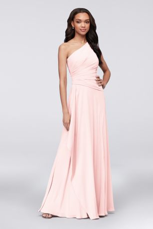 A breathtaking side cascade flows from the asymmetrical draped waistline of this one-shoulder georgette bridesmaid dress. The universally flattering silhouette looks gorgeous on every body type.