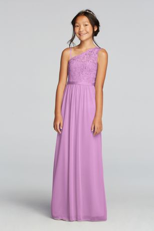 The younger girls in your party will blend seamlessly in this junior bridesmaid dress with a long mesh skirt and one-shoulder lace bodice, plus an optional spaghetti strap.