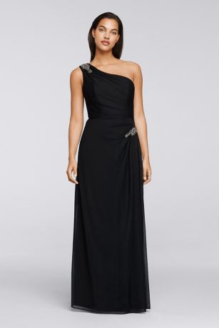 This one-shoulder dress has sparkling bead-embellished appliques thoughtfully placed at the shoulder and hip. An added bonus: ruching that's designed to flatter.