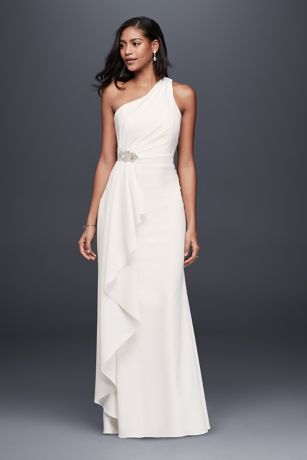 The perfect dress for a beach wedding, this one-shoulder stretch-crepe sheath dress is made even more eye-catching by a side-swept ruffle and bold, crystal embellishment at the hip.