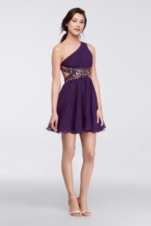 This one-shoulder short dress has the Midas touch with a gilded embellished bodice and open back strap.