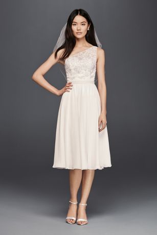 Slip on this one-shoulder lace dress for your wedding reception, rehearsal dinner, or bridal shower. The illusion one-shoulder adds a touch of romance while the beaded appliques on the bodice bring twinkling texture.