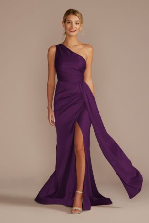 This elegant one-shoulder stretch satin bridesmaid dress from David's Bridal is the perfect choice for any wedding party. The sleek and sophisticated design features a flattering one-shoulder neckline and a fitted silhouette that will accentuate your curves. The stretch satin fabric is comfortable to wear and moves with you, making it easy to dance the night away. Available in a variety of colors to suit any wedding theme, this dress is sure to make your bridesmaids look and feel their best on your special day. Complete the look with some sparkling accessories and heels for a glamorous finish.