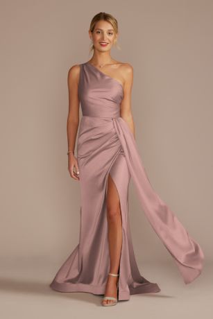 This elegant one-shoulder stretch satin bridesmaid dress from David's Bridal is the perfect choice for any wedding party. The sleek and sophisticated design features a flattering one-shoulder neckline and a fitted silhouette that will accentuate your curves. The stretch satin fabric is comfortable to wear and moves with you, making it easy to dance the night away. Available in a variety of colors to suit any wedding theme, this dress is sure to make your bridesmaids look and feel their best on your special day. Complete the look with some sparkling accessories and heels for a glamorous finish.