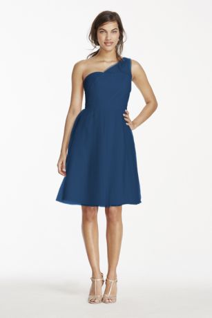 Your bridesmaids will love to wear this short tulle dress! One shoulder bodice features an illusion neckline, paired with a full tulle skirt that hits right above the knee.