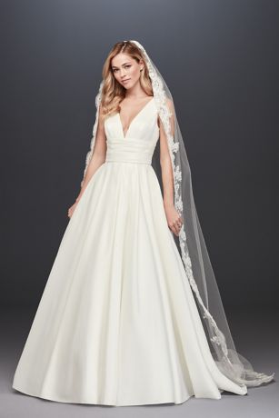 - One tier cathedral veil features thick lace embroidery along the edges.