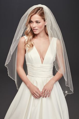 - One mid length tier veil features flower embroidered pattern at the bottom with scalloped edges.