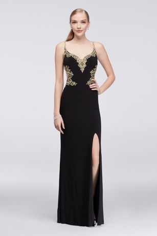 This matte jersey sweetheart column gown is topped with eye-catching beaded embroidery and finished with an open back that lends the sophisticated silhouette the look of a two-piece.