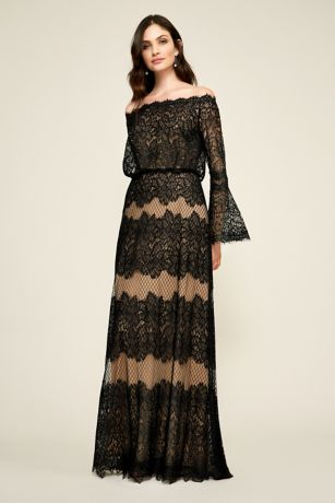 This bohemian-chic gown is topped with an off-the-shoulder blouson bodice and finished with a tiered A-line skirt. Sheer bell sleeves complete the look.