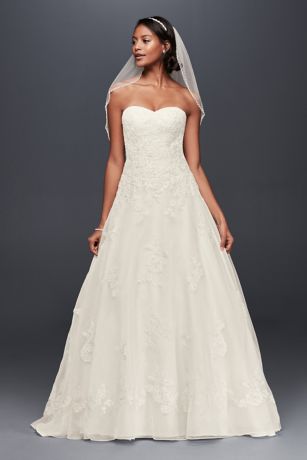 Beaded lace appliques sparkle softly across the bodice and full organza skirt of this soft and romantic A-line gown.