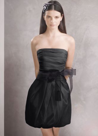 - Modern design features a unique, draped bodice and skirt with inverted pleats and soft bubble hem.
