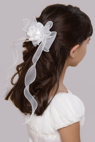 The perfect complement to a communion or flower girl dress, this organza bow is topped with a sweet flower.