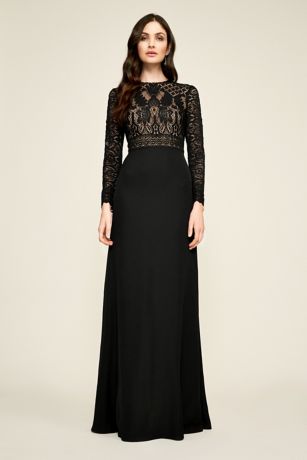 A mixed-lace bodice with long scalloped sleeves tops a sophisticated crepe A-line skirt on this pretty-as-can-be party dress.