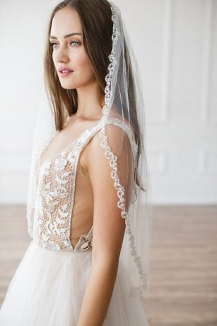 Delicate pearl- and bead-encrusted swirls detail the edge of this English tulle veil. Hand sewn to a sterling silver plated metal comb.
