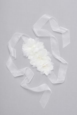 Fluffy chiffon petals on a ribbon sash add an extra touch of romance to your wedding look.