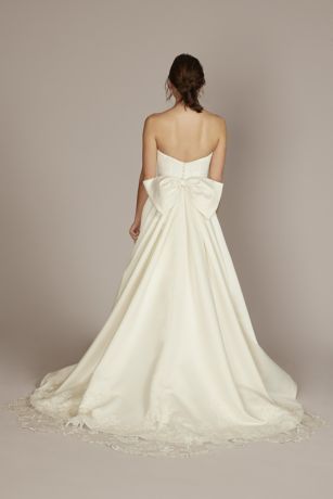 A detachable train adds dimension and intrigue to your wedding gown, no outfit change needed! The standout oversized bow detail and lace trim are a match made in heaven for romantic and whimsical brides.