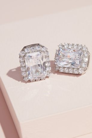Add this elegant pair of halo-outlined emerald-cut crystal clip-on earrings to any look for an extra touch of regal sophistication.
