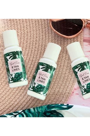 Palm leaf sunscreens make a practical favor for any summer event! Sunscreen labels come printed with \"\"Good Times & Tan Lines\"\" on a palm leaf design.