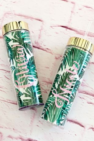 Keep your maids hydrated on the big day and beyond! Each palm leaf-printed acrylic tumbler comes with a gold lid, clear straw, and can be personalized with the name or word of your choice.