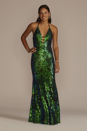 A glistening pattern of sequins add undeniably sexy shine to this sheath dress styled with a dramatic plunging halter neckline. If a bombshell prom look is what you're after, this is it!