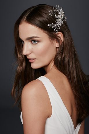 A spray of crystals and petite pearls flourishes outward from the floral center of this sparkling comb. Slide it into a loose updo or along the side of your head for a sparkly statement.