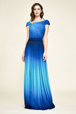 The beautiful ombre colors of this gathered mesh and jersey dress take center stage. Saturated with captivating shades of blue that flow from the asymmetrically draped cap sleeve bodice to the floor-sweeping skirt, the dress is finished with a fitted jersey lining.