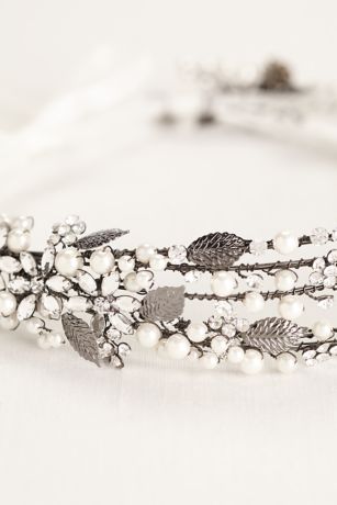 - Multi-row ribbon wrapped headband is adorned with pearl and crystal sprays.