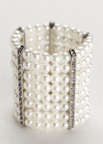 - This bracelet has eight rows of glistening pearls accented by five bars of shining rhinestones.